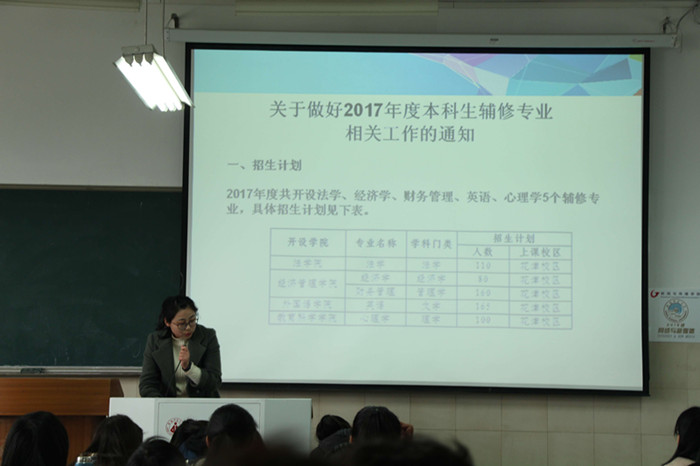 张雁向同学们指出辅修的注意事项,并提出要在学有余力的情况下,根据自己的兴趣爱好与未来规划理智决定是否进行辅修,切不可盲目选择,否则影响专业学习,赔了夫人又折兵。另外,她强调,如果同学们选择了辅修,就一定要加以重视,认真学习,不可敷衍对待,更不主张半途而废。