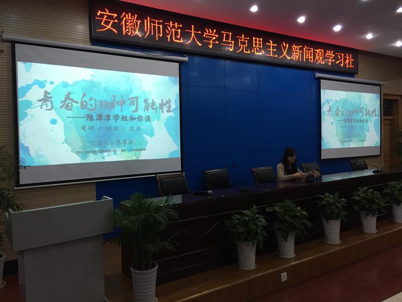 4月14日晚, 2013级文化产业管理专业的陈潭潭做客2015级新闻学专业的“青春的N种可能性”之优秀学长学姐经验分享会,围绕着“创业”、“就业”和“考研”这三个关键字,新闻学子们与陈潭潭进行了一场面对面的交流。