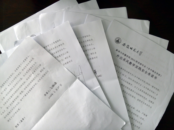最后,大家在孙老师的带领下认真学习了《外出采风教学实践安全承诺书》,每一位同学在承诺书上庄重的签下了自己的名字。据悉,本次采风教学是根据动画专业培养方案作出的统一教学安排, 15级动画专业(含中韩合作班)全体59名员工将于3月23起至4月10号,奔赴皖南地区进行采风写生实践教学活动。(图/文 2015级动画专业)