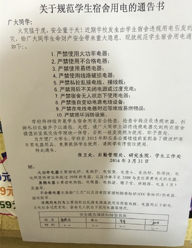 为动员激发员工干部自我管理、自我教育和自我服务热情,提升班委同学责任担当意识,切实以群防群治扎实推进校园安全教育管理,守住安全保障底线,辅导员马星宇每周召开班委例会严格强调离校登记、安全规范用电、零点报告等制度,班级安全委员、生活委员每周参与例会,专题布置相关工作。两个专业动员所有班委参与查寝,每周由班长、支书和副班长轮周当值报告每晚查寝结果;每周统计员工周末(小长假)等离校情况,周五傍晚例行向家长群公布,密切家校联系;安排班委开展了插线板固定工作,保障了用电安全,同时还将《关于规范员工宿舍用电的通告》以安全须知书的形式张贴在每个寝室门后,人人签字确认,受到了同学们的理解与支持。