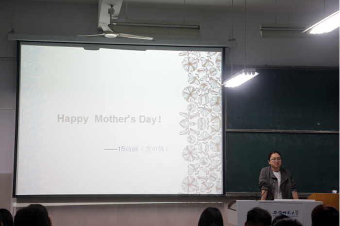 在动画专业的活动上,主持人首先提问“想到母亲你最先想到哪个词?为什么?”辅导员孙文,第一个与大家一起分享了自己的答案。接着,班级里同学们也都踊跃发言,大家仿佛都颇有感触。接着,大家一起思考自己多久给妈妈打一次电话,许多同学默默的低下了头;最后,同学们玩了一个小游戏,“大家轮流说数字,说出3和3的倍数”的同学要当着全班同学的面给妈妈打电话并说出“妈妈我爱您”。这个游戏调动了活动的整体气氛,同学们玩的起劲,输的同学也都愿赌服输。中韩动画的一个男生按要求给妈妈打了一通电话,电话的最后大家一起向喊出:“妈妈,节日快乐”。