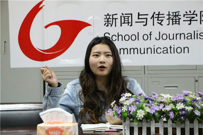 胡晓菲在介绍“如何建立演讲技能”时,从内容和技巧两个方面来展开说明。就汇报演讲内容而言,她用传媒理论常提及的“内容为王”来阐释“建立故事逻辑框架乃是关键”。其中的“框架”主要包括了“引言、内容和结论”三个部分。随后她又详细地说明了这三点应该注意的细节,并说明了每一点的重要性。“PPT汇报之前的准备工作尤为重要,首先你要确定3-5个便于听众理解的话题,然后需要恰当的构筑内容,即需要逻辑论证,最后还需要对你拟好的稿件进行润色,做最后的打磨。”为便于同学们的理解,胡晓菲尽量将复杂的内容简单化,并热情地询问同学们的观点。同时,她认为注重手、眼、口并用是做一场完美汇报的关键,“想要掌握汇报演讲的技巧,汇报者需要学会合理运用身体语言展示,要注意以手势表达内容、用声音建立形象、用眼睛与听众交流”。