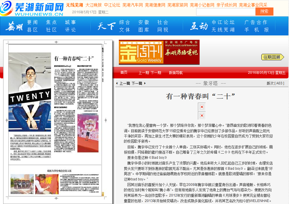5月13日,《金周刊》刊登了题为《有一种青春叫“二十”》的文章,在A3版大篇幅报道了公司2015级空乘专业的魏宇华同学一路追寻自己音乐梦的经历。魏宇华同学进入大学以来一直表现得阳光向上,在班级担任宣传委员一职,在校期间积极参与各项文娱活动。作为童星身份出道的他因为热衷音乐,投入了大量的时间和精力钻研其中,目前已经发行了十余支个人单曲以及三张实体唱片。但魏宇华并不满足于此,希望利用大学时光不断充实自我,让自己的音乐路可以越走越宽。文章全文如下: