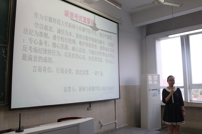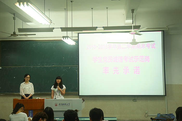 为积极响应公司“两学一做当先锋,部校共建创一流”学习教育,发挥员工党员、入学积极分子的先锋模范带头作用,以点带面营造风清气正的考试氛围。2014级新闻、广告、摄影、动画专业的员工党员、入学积极分子率先在公司内组织“员工党员诚信考试示范岗”活动,在考试期间认真做好考试提醒、座位排序和考场清理等勤务工作,真正发挥党员模范先锋的表率作用。会上,员工党员和入学积极分子代表纷纷走上讲台,率先承诺,积极表达对于诚信考试中如何发挥员工党员率先模范和服务同学的思考、观点和看法。2014级新闻学预备党员何修豪说:“我们要以‘人如傲菊不畏难’的心态直面考试,更要以‘心似兰花一片清’的心态准备考试。”2014级广告学预备党员陈苏洁也表示,作为老员工党员我们要坚决与违反考试纪律说不,要坚守道德红线。大家对日常考试中舞弊行为的质疑,2014级摄影专业预备党员方旭谈到,希望同学们敢于向这些行为说不,尽可能的减少负能量的影响,积极主动地以党员身份去影响身边的同学,多传播正能量,在关键时刻,应该牢记党员身份,坚守信念。2014级广告学预备党员张进文说:“我们要尽最大努力去发挥员工党员的力量,敢于发声,甘于奉献,为公司营造一个良好的学习考试氛围。动员广大党员、积极分子在期末考试中发挥自身的模范作用,不仅要自身学习优秀,更应带动广大同学认真复习,诚信考试,让“创先争优”活动的阵地转战自习室、考场,在学习和考试中发挥党员的模范作用,争当诚信考生,考出优异成绩。