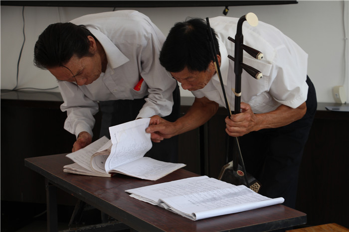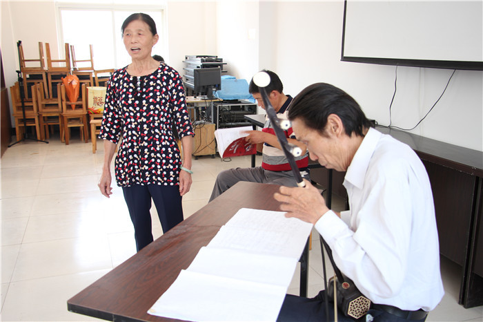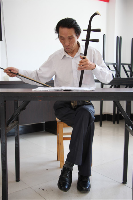 1957年加入新声剧团时祝文祥才13岁,祝文祥会的乐器很多,锣鼓、二胡、铙钹……可谓是十八般武艺样样精通,而他最爱的也最擅长的是二胡,他手里的二胡就一直没放下过。他在现场即兴唱了《风尘女画家》中的一小段《忽听琵琶》,淳朴流畅的唱腔是岁月给予的沉淀。祝文祥身材颀长,大背头梳理得很精致,很难看出这位饱经风霜的老艺人已经73岁了。早年在宿松师范进修的他后来一直接和剧团结下了不解之缘,酷爱音乐的祝老子女也大多走上与音乐有关的道路。