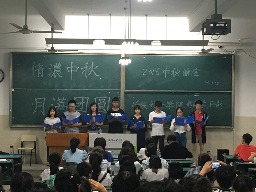 9月15日,农历八月十五日晚,天空阴沉,下着小雨,但教室里却欢笑满满。2016级新闻学、网络与新媒体,两大专业、三大班级140名同学和辅导员张雁老师欢聚一堂,共度中秋。