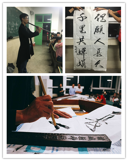 吴侬软语乡音美,笔耕墨耘抒真情。在持续的掌声将晚会推到高潮之际,新闻班“弹剑书生”许健伟同学为我们表演书法才艺。以遒劲的书法赋予了“但愿人长久,千里共婵娟”新的韵味,十个字力透纸背,字样大气磅礴。随后他以箫带笔,和胡笑同学共同演奏了歌曲《水调歌头》,引得观众们连连欢呼。