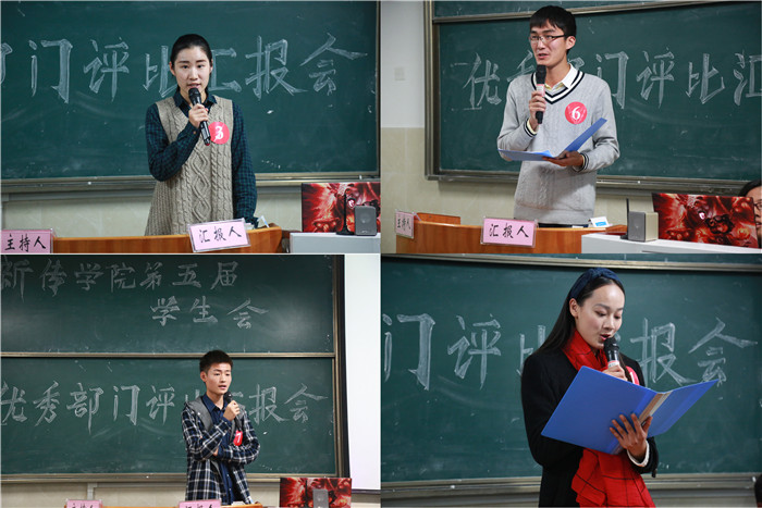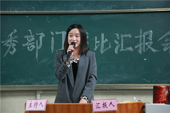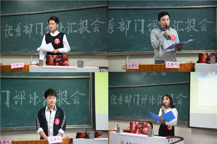 认证部、宣传部、女生部、新媒体部、组织部、实践部、心理健康部、学习部、体育部、办公室、文艺部、技术部、生活部按照抽签顺序依次进行汇报,通过一张张内容详实、图片精彩的PPT汇报,在6分钟的时间里,与老师同学们分享一年的工作和成长。实践部用亲切平实的话语,讲述一个个稚气未脱的大一新生成长为员工骨干的励志传奇,宣传部用“以继承之姿,再踏征途”,“借光影笔尖,记录经年”,“将初心存放,水远山长”三个主题诠释了宣传部作为动态发布机和咨询传达室在幕后的宣传报道;新媒体部用“简历”这种新颖独特的方式介绍了新媒体部这个新成立部门的发展历程;体育部以“on my way”为口号、斗志昂扬、催人奋进,使人深刻感受到他们的阳光积极……