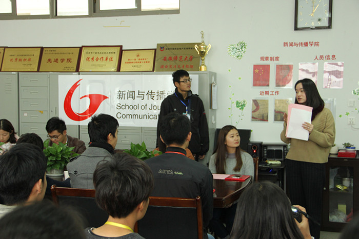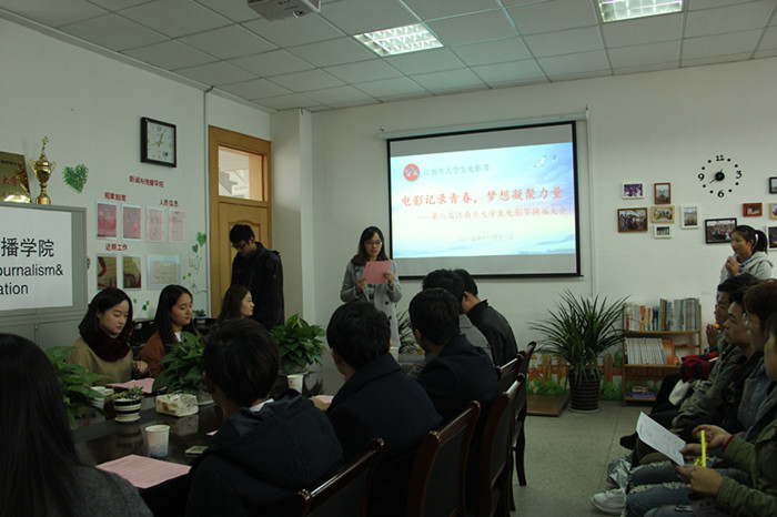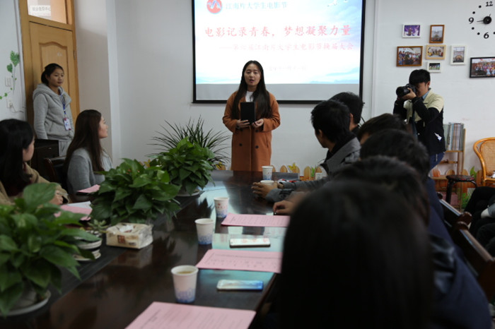 第五届组委会主席徐丁和大家分享了她在组委会工作生涯的点滴感悟。她分别用逗号、句号和感叹号形容了自己在组委会由懵懂走向成熟的过程。回顾过去,徐丁感谢老师的指导、同学的帮助,更感谢组委会带给他的温暖。她说,在组委会两年的时光是她大学四年生活最精彩的一部分。展望未来,徐丁寄语新成员“任重而道远”期待电影节能在大家齐心协力的努力中越办越好。随后,新任主席吕汉东发言,他以守门员的职责自喻,用“行胜于言”立志向、表决心。表达了他服务集体,奉献力量,带领组委会全体成员们一起进步成长的决心。