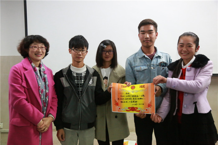 桂万保老师宣布了辩论赛获奖班级与优秀辩手,最终新闻班取得了这场辩论赛的胜利。吉文龙同学获得最佳辩手的称号。老师们分别为获奖代表队、优秀辩手和最佳辩手颁发奖状并合影。