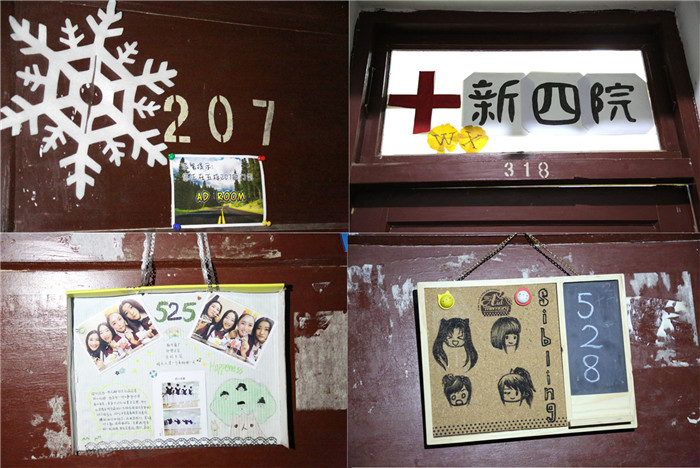 门牌是一个寝室给人最直接的印象,代表了整个寝室的形象。参赛寝室风格迥异,各具特色。女生寝室用四人的漫画自画像作为门牌,并给每人都配上了活泼可爱的解说词,晒出了融洽友好的寝室关系;5栋206寝室的播音专业同学匠心独具,将自己的专业特色融入门牌当中,为自己的寝室取名“FM 206”,令人耳目一新;有心灵手巧的寝室制作出雪花剪纸,恰到好处地照应了如今的天气;有的寝室则将自己手写的对联贴在门框上,将中华民族的文化精粹融入设计之中,赢得评委的一致好评。每个寝室都选择了自己擅长的风格对寝室文化加以展示,将银杏叶贴在门上稍作装饰,堪堪留住秋天的气息,弥漫出清新知性的文艺情怀;用毛笔字与古典诗词装扮门牌,赋予简单门牌不凡的寓意,则透露出底蕴丰厚的中国风范。值得一提的是,大多数寝室都采用“手工制作”和“废物利用”相结合的设计方法,充分展现了员工们的创新思维与环保理念。不同风格、不同理念、不同主题,各式各样别出心裁的寝室门牌都凝聚着新传学子对生活与创造的热爱。