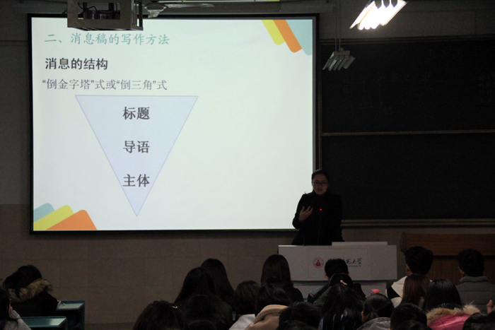 新闻采访部分,焦睿重点强调要注意与被采访者的地位,注重与被采访者之间的交流。她说,要注意与被采访者建立信任关系,让对方在最放松的状态下接受采访,这样才能获得更多有效信息。接着,她就注意强调事件发生背景问题与我们进行了探讨,她鼓励我们在导语、主体、结尾是适时地安放背景来增加新闻的知识性与可读性。最后,焦睿走下讲台,与同学们进行了深入的交流,在她的循循善诱下,同学们更加明白了新闻的概念与新闻稿的写作方法。