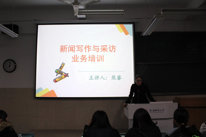 12月11日晚7点,2015级广告学、播音与主持、动画(含中韩合作)三大专业齐聚2050302教室,成功举行新闻稿写作专题培训会。结合15级新生特点,本次培训邀请了前校老员工记者团团长、10级播音与主持艺术专业班长焦睿,为大家做了一场生动、详细的新闻稿件写作交流会。