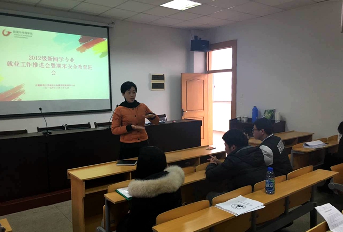 2015年12月28日下午,2012级新闻学专业在公司四楼会议室召开了毕业班就工作推进会和期末安全教育班会,会议特别邀请了公司党委副书记宋静和新闻专业主任马梅出席,辅导员老师张珺琢主持班会。