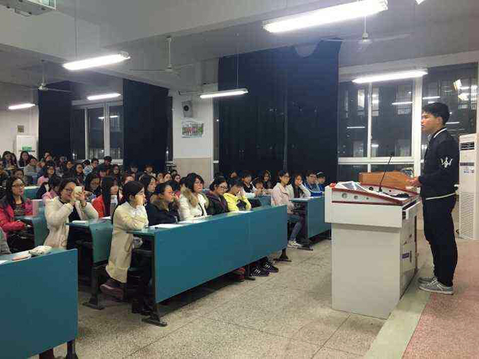 3月4日晚,播音班第三团小组及第四团小组则结合自身专业特色在2040304教室向同学们义务展开普通话测试培训活动,帮助广大同学能顺利通过普通话等级考试。他们提前在大一新生群里发布了培训通知,吸引了其他专业近150名同学前来聆听。班长殷武和副班长邹升浩事先准备了普通话教学的ppt,向大家详细讲解相关的发音技巧。除此之外,主讲人邹升浩还告诫大家考试的时候要注意掌握合适的语速,用清晰响亮声音字正腔圆地去读出每个汉字。最后,他们还向同学们发放了自己整理的练习资料,一对一地对在场的其他同学们进行讲解与分享。