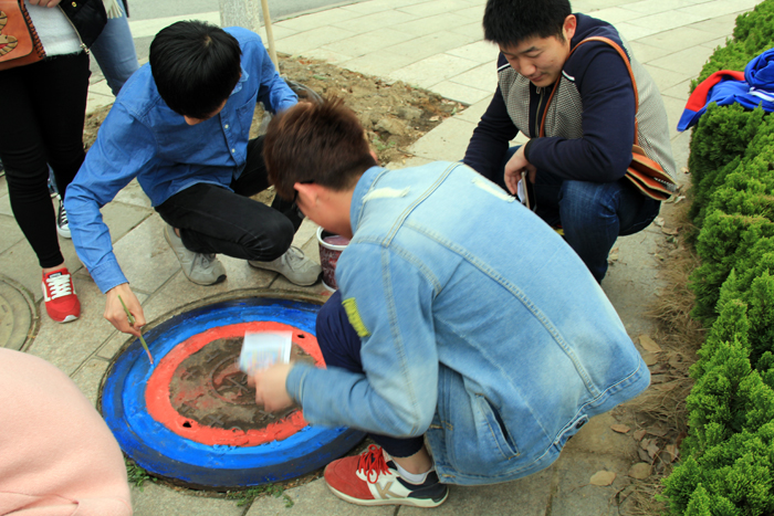 3月5日下午,广告学专业和动画专业的同学们则对东门附近建筑工地旁的井盖进行了装扮。一个个圆形井盖在同学们的多彩的画笔下装扮成了不同风格的图案,有雄伟的建筑模型、可口的红柚、还有调皮的动画“路飞”形象。该活动本着“学雷锋日,美化校园”的初衷选取一些既可爱又能传播正能量的图案进行设计,旨在美化校园传播正能量。据了解,由于经费有限,工作量较大,他们只选择了建筑工地旁的井盖进了美化。动画班同学张继敏说到,“之前也有学长学姐做过,我们不想美化井盖的活动流于形式,只要条件允许,我们想把全校的井盖都扮靓起来!”