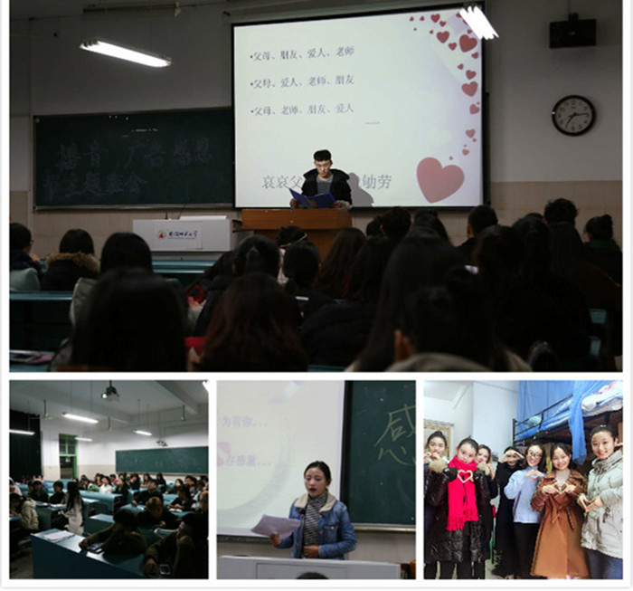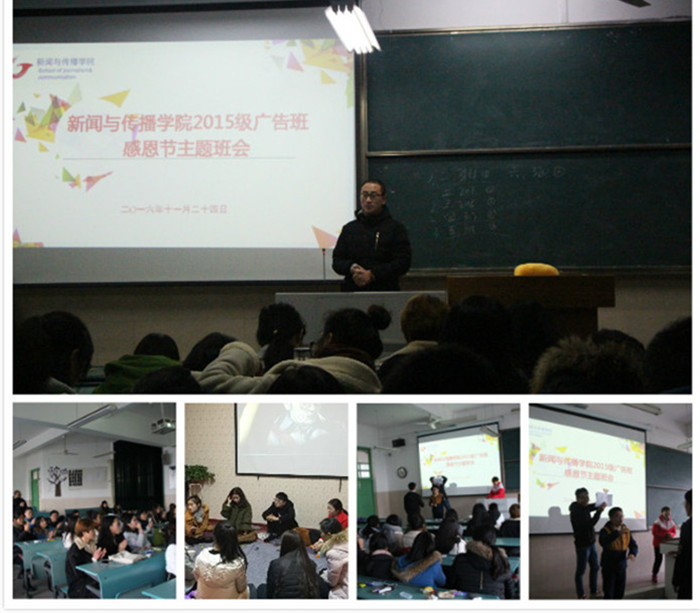 公司其他班级的感恩节主题班会活动也以不同的方式得以展开。15级动画班通过朗读有关父母的感人故事,向同学们传递了“哀哀父母,生我劬劳”的思想,让大家对父母辛苦的付出有了更深的体悟,并在班级同学中引发了广泛热议,产生了较为强烈的效果。16广告班更是以精美的PPT给大家展示了精彩的感恩节大游行、大餐等等。心理健康委员通过提问的方式让大家给父母、朋友、爱人在自己心目中排序,得出统一的结论:感恩始终把父母放在第一位。