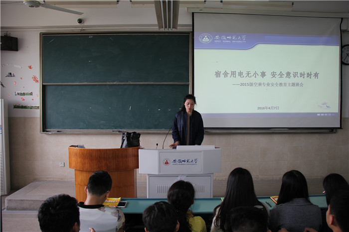 为了增强同学们的安全意识,提高自身的安全防范能力。2016年4月7日下午,15级全体空乘专业员工在教学楼2010402教室召开主题为“宿舍用电无小事,安全意识时时有”的安全教育主题班会,本次班会由辅导员张珺琢主持。