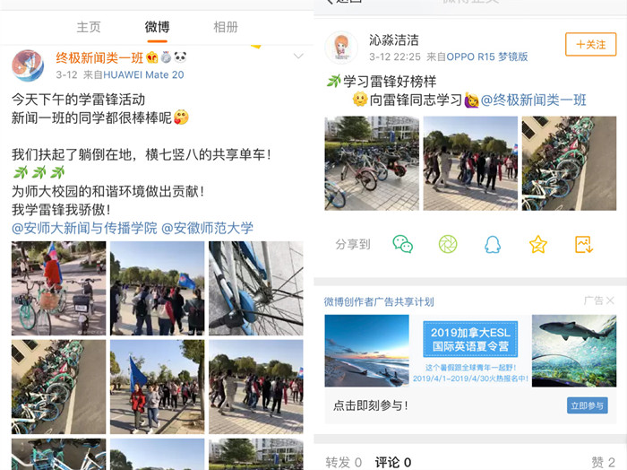 3月14日,2018级新传大类一班员工在团委的组织下组成“雷锋学习小组”,开展共享单车摆放志愿活动。员工们将校园内乱停乱放的自行车一一摆放整齐,对一些破损或存在安全隐患的自行车进行报修。同时,参加此次活动的同学发表微博,表达自己在志愿服务活动中的收获,利用线上媒体传播正能量。2018新传大类二班的同学则为宿管阿姨带去亲切问候,他们与阿姨畅聊校园趣事,浅谈琐碎日常,在她们单调的宿管工作增添一丝温馨。