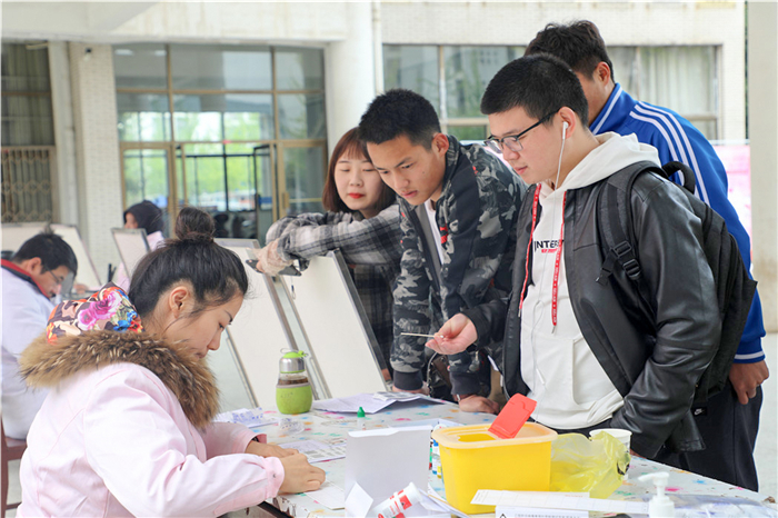 正午烈日当空,沸腾的温度、拥挤的人群、同学们高涨的热情,这正是献血现场最真实的写照。前来报名的同学主动排队,秩序井然地等待献血,依次完成了填写报名表、抽血化验等准备工作。