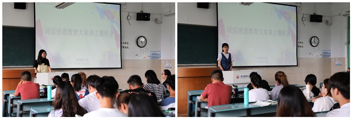 主题班会一改“一人说,众人听”的形式,通过“诚信感恩教育大家谈”,由同学们自愿走上讲台,围绕个人、集体、国家和社会发展中“失信”行为的危害,讲述“做诚信人、说诚信话、办诚信事”的必要性和重要性。既有理性的思辨分析,也有感性的认知分享,得到了台下同学的共鸣和赞许。孙月婷为同学们详细解读了助学贷款的相关政策文件以及注意事项,强调“诚信还贷”的本质是“诚信立人”,要努力让自己成为讲诚信、知感恩、树自强的高素质老员工,塑造优良的班风、学风。