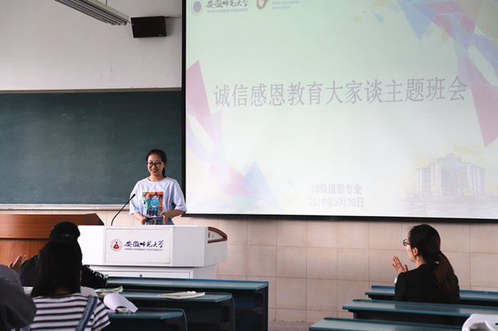 适逢校院举行“员工资助诚信教育”“5.25心理健康”主题月系列活动,为了进一步培育大一员工的诚信意识和品质,构建诚实守信的资助育人文化,在广大同学中普及心理健康知识,防范夏季安全隐患,2018级播音、摄影专业于近期召开诚信与心理健康暨夏季安全教育主题班会。班会由辅导员老师孙月婷主持。