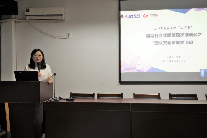 张雁就“团队安全与成果”这一点进行重点强调。她指出,团队安全是所有活动中的重中之重,是一切活动开展的前提。她从“四防”“五个注意”“六项措施”入手给大家强调了暑期实践安全的注意事项。她要求各队需要开团队会强调安全意识,队长及安全委员在实践过程中需要及时报告队员情况,随时注意安全问题。另外,张雁带大家梳理团队暑期实践活动的预计成果清单,包括新闻稿件、实践图片、实践视频、实践日志等。最后,她鼓励各暑期实践团队的员工要做出优质、打动人的内容,充分利用社会实践这个大平台,发挥专业优势,挖掘专业潜力。(文/院团委员工会宣传部刘煜 图/胡甜甜)