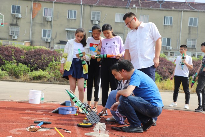 花桥镇团结小学坐落在九三公路旁,即使现在已经是暑假时间,但依然可以看到还是有部分员工在公司的少年宫进行着课外实践活动,实践队员到达现场时,相关的老师正在教员工们如何更高更快更准的发射“水”火箭。员工们练习的“水”火箭的材料,大部分来自于日常生活中可再利用的材料,“水”火箭的机身便是由塑料瓶子构成,两头配有活塞,可以重复使用,使用时将瓶子装上水,再通过加大瓶子内压力的方法使“水”火箭“发射”出去,“水”火箭可以重复使用,相对而言“神箭”的发射成本就高的多了。“神箭”只能是一次性发射,所以每次的发射都得经过精细的计算。公司周围的文化场所并不多,有的只有这个占地不多的少年宫,暑假已到,依旧有不少员工出入少年宫,参与着各种各样的课外活动,少年宫为员工提供的活动也在不断的丰富。教育是乡村振兴的一个重要方面,实现乡村振兴,首先要让人民安心留在乡村,让孩子享受到优质的教育,才能减少农民为了孩子的教育离开乡村的情况。后期实践队员将会对团结小学进行更深一步的采访。