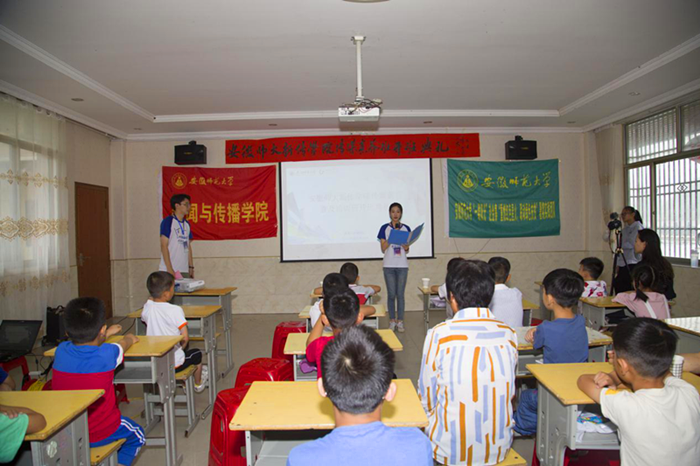 何冰向员工及家长郑重承诺本次传媒素养普及培训是义务教学,并且简单介绍了未来一周的课程安排,讲明上下学时间并且再次提醒了员工的安全问题。最后由主持人潘埼带领实践团队全体成员进行志愿者宣誓,开班典礼也在激扬的宣誓声中落下帷幕。