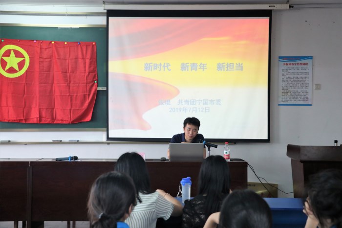 下午1点,在仙霞中心小学敬业楼的多媒体教室,钱琨书记给实践队员们上了一堂生动而又深刻的团课。课上,他通过讲解、提问、探讨等多种互动方式,分为四个部分,为大家解读“新时代,新青年,新担当”背景下青年人的使命与担当。一代人有一代人的使命,他将历史时钟往前拨动,无数个青年人在革命长河中闪耀的瞬间正印证了这一句话,“每一代人有不同的考验,每一代人有不同的希望”;就如何经得住考验,他提出新时代,青年人要树立正确的价值观,钱琨巧妙地抛出了青年人的“三粒毒药”,指出在新媒体时代下我们更应该抵制诱惑,坚守价值;在牢固树立新思想方面,他结合以团员身份被派到赵家河村“整队”的习近平的故事,强调青年人应该不忘初心,坚守理想信仰;最后钱琨总结了青年、国家、时代形影相随铁三角的关系,以及当新时代来敲门时青年人所该有的姿态。
