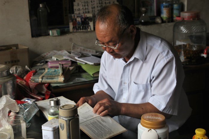 于是眼睛代替双腿,他在药书中翻山越岭,孜孜以求。“晴天的时候,过来收购的村民最少有15个,最多的一天有60个哩。”等待村民上门的时间是属于祝光荣的,他喜欢戴着他那副胶着了好几处的老花镜,坐在斑驳的旧书桌下捧着药书、报纸静静地看,“《本草纲目》、《中草药大全》这些书我都看,可以收购哪些药材,我都在前面给打上勾。”用黑笔勾出的痕迹越来越多,祝光荣收购的药材品种也越来越丰富,成了仙霞村里颇有声望的收购商。