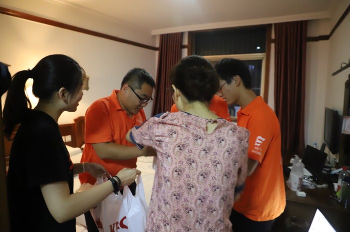 7月18日晚八点半,在TapTap点点赴宿松“聚焦脱贫再发展,探索乡村振兴路”队伍的驻扎地孚玉山宾馆,公司党委书记张师帅、党委副书记宋静、副经理赵昊、摄影专业主任李化来、新闻学专业教师张泉泉等公司领导老师向宿松队的同学们进行慰问,并且为同学们带来了喜爱的美食肯德基全家桶套餐。