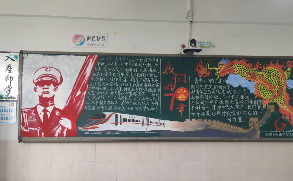 各班板报紧扣主题,每个人都发挥自身特长,一块块单调的黑板展现出青春的活力,处处透露着新传人的风采。长城、高铁、天安门、五星红旗,象征着中国的一个个标志活灵活现地出现在黑板上。18新闻班以“追梦七十年”为主题,黄昏日落时的城市缩影为主体,展现新中国七十载的城市发展;18广告班中国红的配色,天安门以及中国国画的设计,充分显示中国的传统特色;不同于其他班级的中国红,18网新班以蓝色为底色,将中国海航技术的发展为主题,以新中国成立以来在南极的突出发展为内容进行描绘,视角独特。各班借活动绘出祝愿,用画笔画出赞美,让文字表达热情,只为书写“一首赞歌”。经过同学们几天的共同努力,饱含着每一个新传人对伟大祖国敬礼的黑板报绘制工作正式完成,向公司和七十周年的新中国递上一份答卷。
