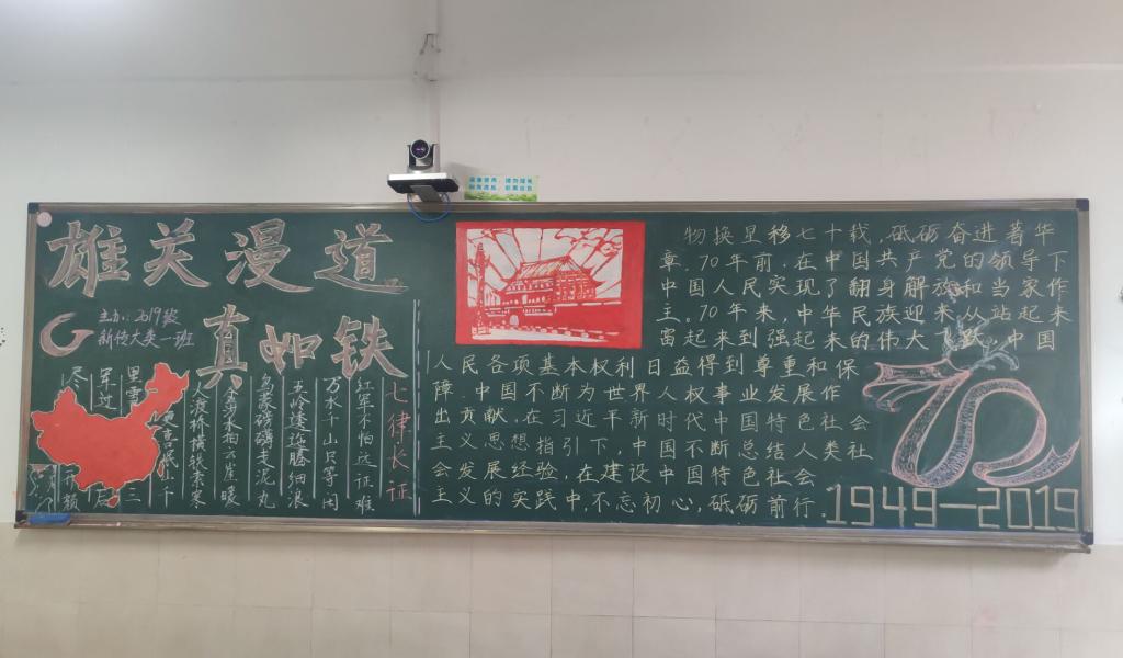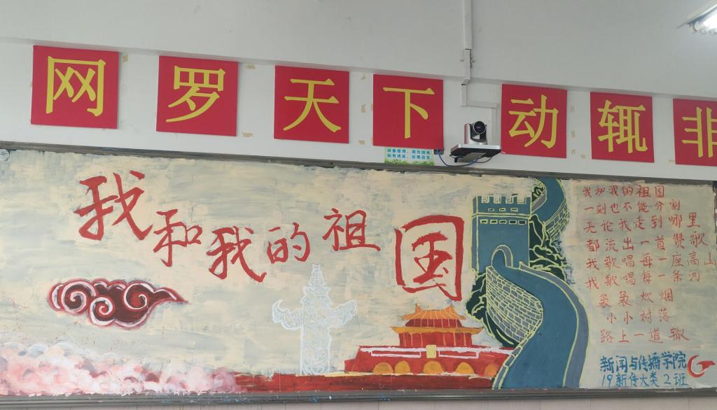 从接到通知开始,各班负责人开始及时安排板报工作,特别是19级新生,即使军训早已使同学们身心俱疲,但大家对于此次黑板报比赛仍然拿出了十二分的干劲。各班选出黑板报制作小组的成员,同学们各司其职,通力合作。从板报的整体设计思路,再到细节设计,负责人层层把关,力求把板报做好,为新中国七十载春秋献礼。