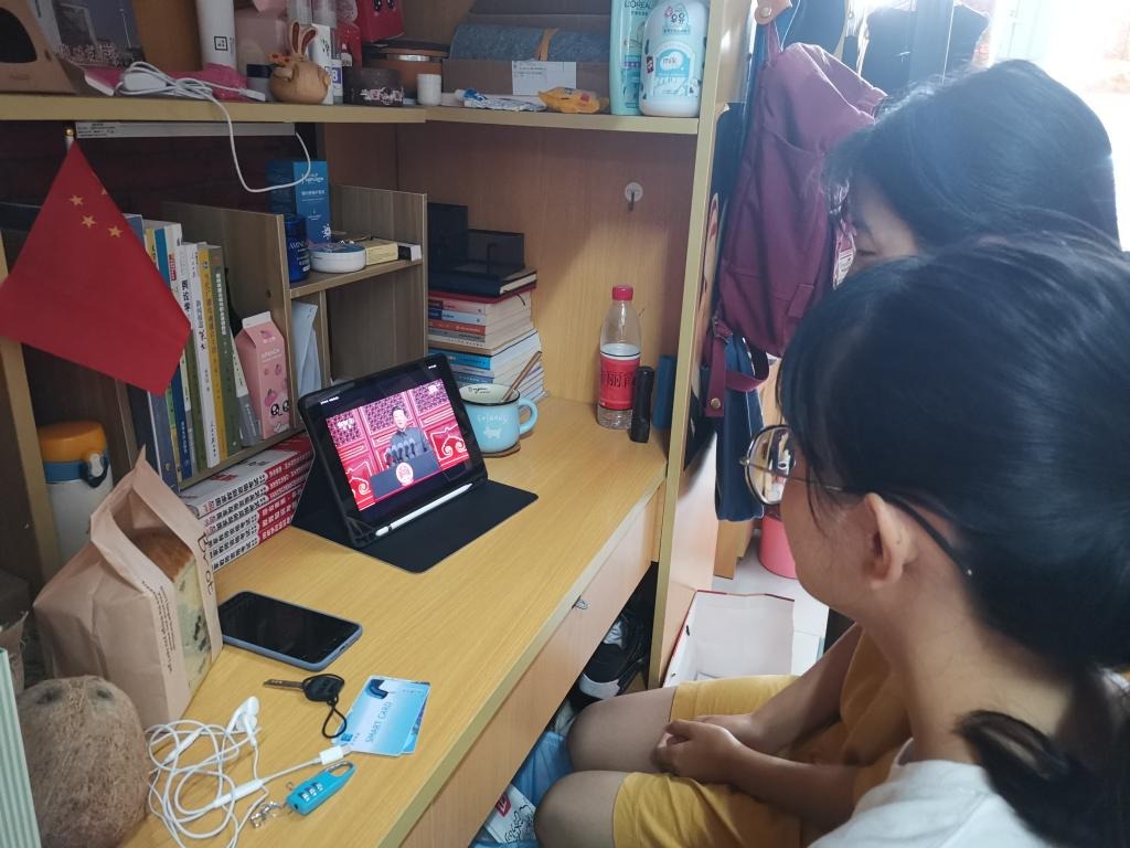 在宿舍与室友共同观看直播的陆丽霞和闫硕也怀着无比激动的心情。陆丽霞说:“开国大典到70周年阅兵,人民生活日新月异不断升级,迈过天安门的脚步却凭这些而依旧的坚定,开拓奋斗里不忘峥嵘岁月,参与阅兵的人让人发自内心地觉得,不是为了完成一种仪式感,是深处的自豪感和不变的爱国心。 ”闫硕说:“感动来自震撼。分列式上,无论是整齐的步伐、响亮的口号,还是各类地面装备、空中编队,让我由内而外得产生一种自豪感。感动也来自细节。习近平全程站着,胡爷爷举起的颤抖的双手,让我印象深刻。阅兵不仅仅是那一段距离,所有细节也都体现着人民解放军的纪律性与组织性。作为一名新闻学子,透过车的反光镜看细节、透过各种机位看细节,是一种学习与成长,感动还来自不同角度看到本就不寻常的细节。”