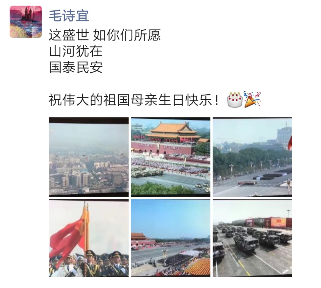 除了观看阅兵直播,同学们还积极参与各地国庆活动,在微博、朋友圈为祖国点赞、观看主旋律电影……2017级新闻班的同学们,用自己的方式表达着自己的对祖国的热爱与期望。
