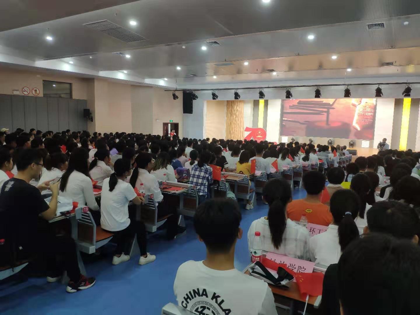 在公司的号召下,17新闻班国庆留校的同学们也早起前往理科实验大楼报告厅参与观影活动。观看阅兵前,校团委组织老员工在现场表演“我和我的祖国”青春快闪活动,师生们用热情激昂的歌声,热切真挚的情感,唱出了迎接新中国成立70周年的喜悦,抒发了对祖国的热爱,为祖国献上了最热诚的祝福。