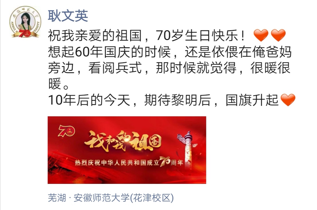 而国庆期间奔往家乡的同学们也选择不同的方式与祖国共同庆生。曹云佳同学在高铁上伴着卡顿的网络观看了直播全程,“我看阅兵是一边看一边哭过去的,一点没夸张,看着国家领导人、看着军人、看着这些武器,看着踩车,眼泪就不由自主地流下来,一方面是因为自豪,一方面是想到国家的发展和背后无数个人的付出,这是我无法企及的大爱。”来自首都北京的陈佳一同学不但在归途中看了整场盛典,还在假期中与父母共同前往天安门广场,在新国徽前、在庄严神圣的国旗和纪念碑前,许下20岁的心愿:“2019年新中国成立七十周年,我刚好二十岁,和爸妈一起来天安门。希望三十年后的2049年,新中国成立一百周年,我五十岁,依旧能和爸妈一起见证祖国的百岁生日。”