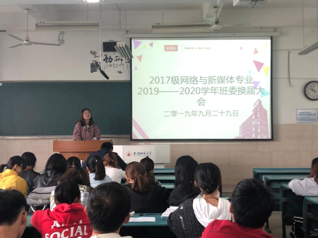 新学期伊始,为了班级工作稳定有序地开展,10月11日上午,2017级网络与新媒体专业召开班委换届选举大会,公开选举2019-2020学年班委会成员,辅导员张雁和全体同学参加了此次会议,会议由团支书宋诗雨主持。
