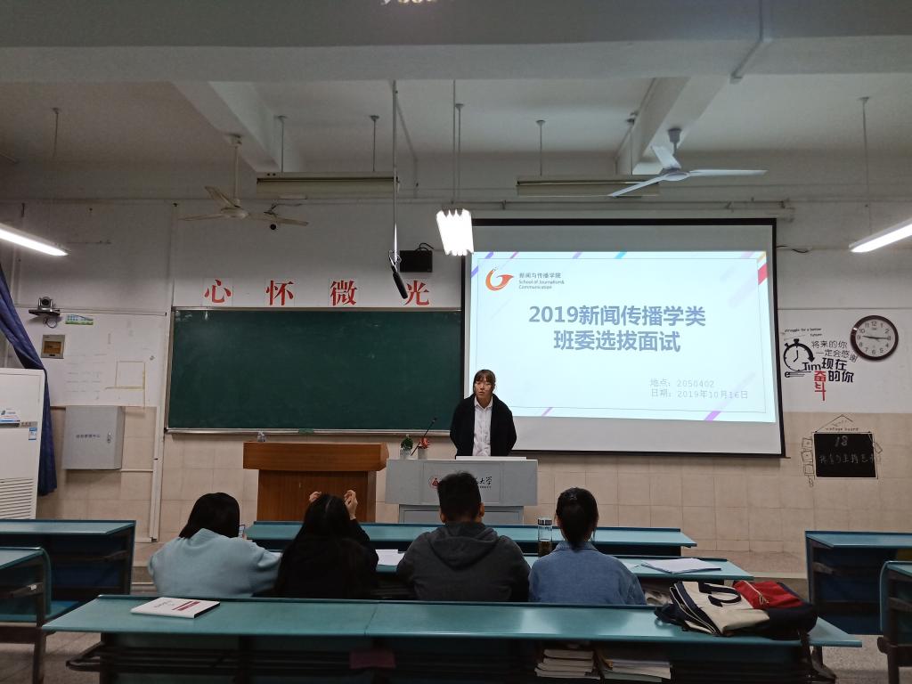 员工干部是连接师生的桥梁,是班级建设的核心力量。在新生开学之初,为深入了解同学们的性格与能力,组建一支认真负责、热情高效的班委团队,2019级新闻传播学类辅导员马星宇全面征集各方意见,通过面试、笔试、民主投票三个环节综合考核各班竞选者。此次班委选拔活动共持续一周,由导生陈丹、商若彤、何小蝶、章子悦、王儒钰、赵玥先、谢妮辅助完成。
