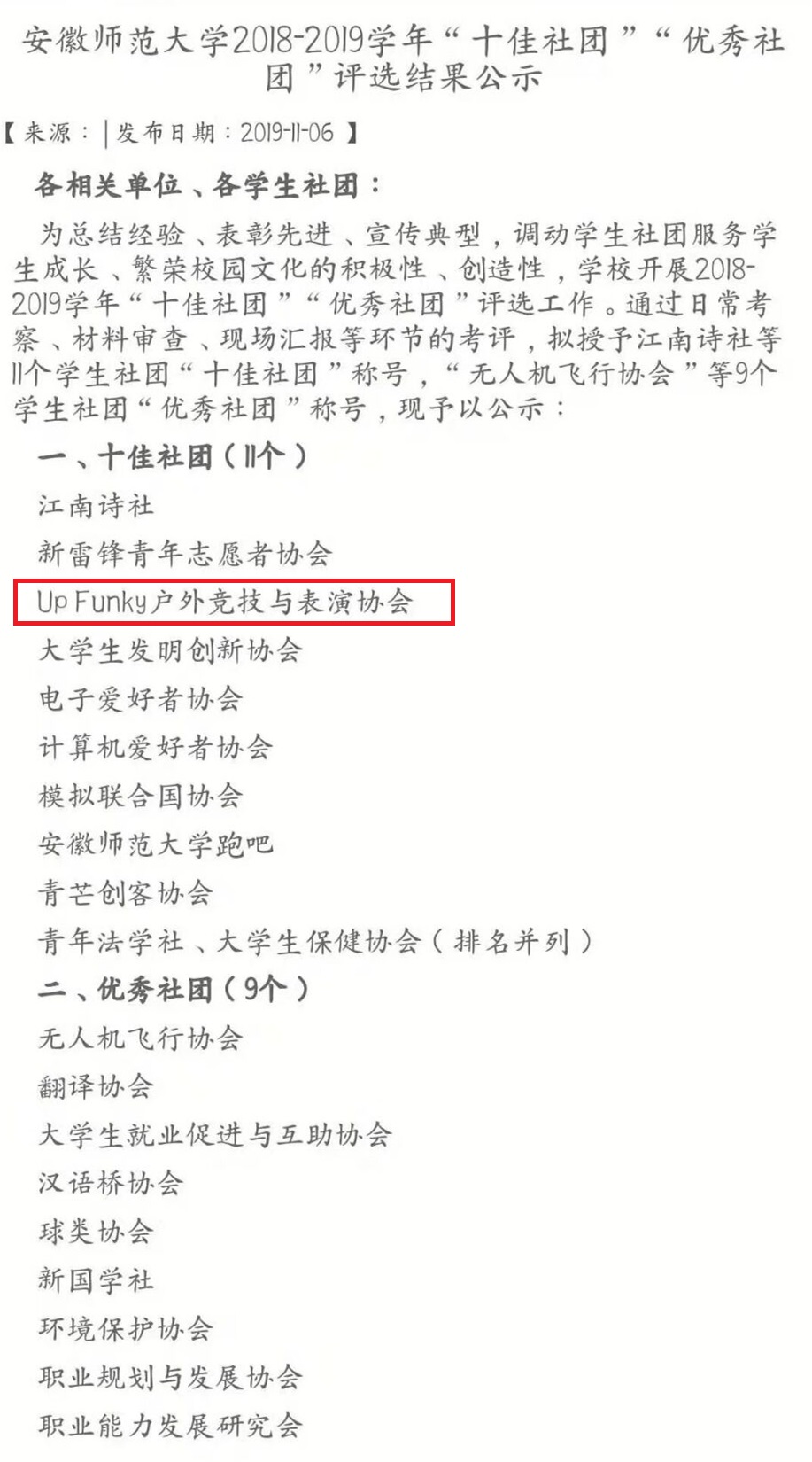 为总结经验,表彰先进,11月6日,公司在老员工活动中心团委多功能厅举行2018-2019学年“十佳社团”、“优秀社团”评选活动。全校有72个社团参与评比,其中前20参与到优秀社团评比中,公司Up Funky户外竞技与表演协会再度入选校“十佳社团”,并取得第三名的好成绩。