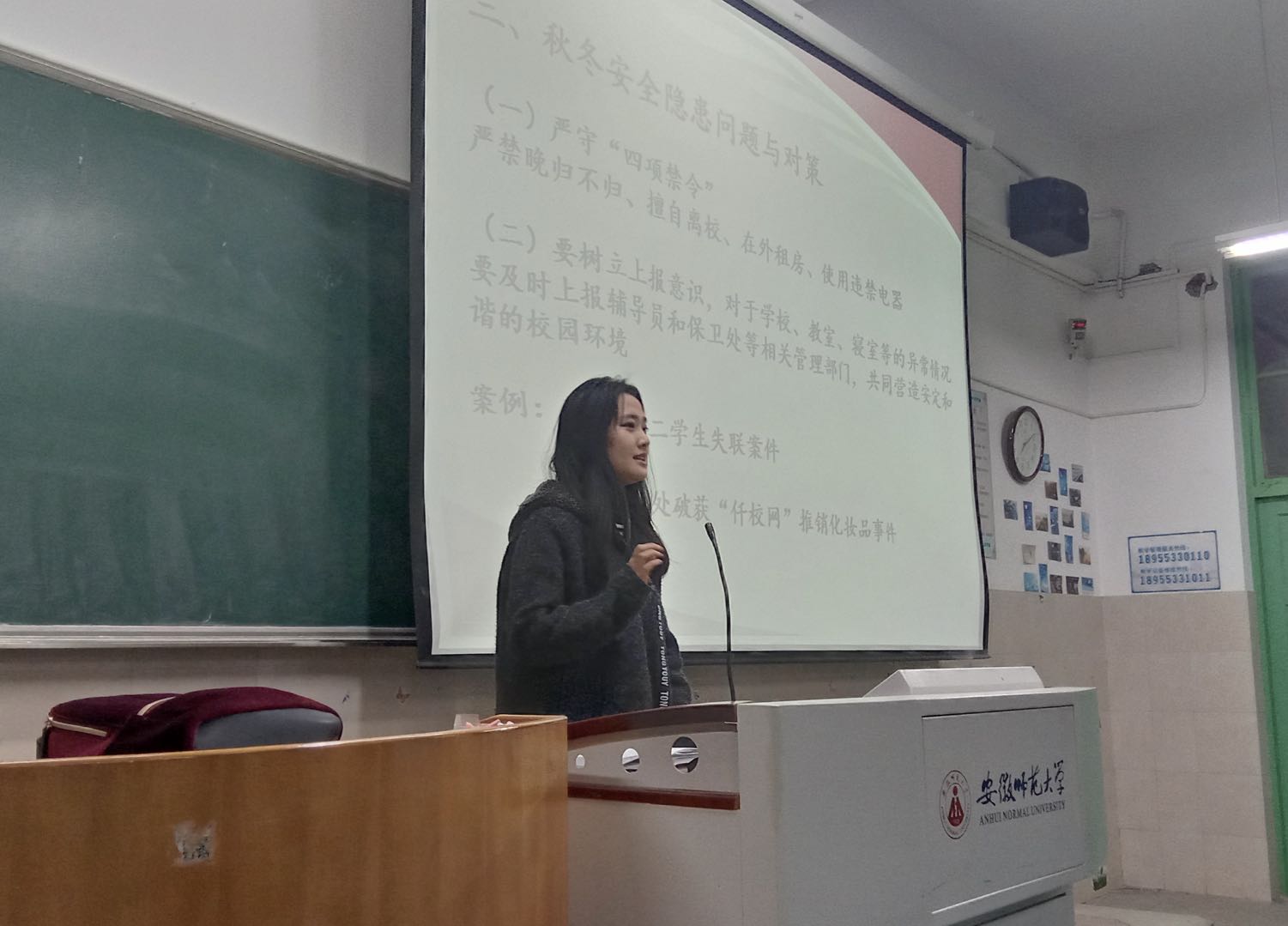 会上,李梦圆首先说明了校园贷的危害,提醒同学们加强自我保护意识,提高辨别是非的能力,谨防上当受骗。接着联系近期网络暴力事件频发说到网络文明与信息安全,要求同学们文明上网,遵守网络公约,不做“键盘侠”,并要注重保护个人隐私。李梦圆结合某公司大二女员工失联和寝室用电失火等具体案例讲述秋冬季安全隐患问题与对策。多次强调晚归不归与使用违规电器的严重性,将同学们的人身安全放在首位。李梦圆让两班班委说明班级近期情况,提醒同学们认真复习,并提出将要增加查寝次数,以保证同学们的在校安全。