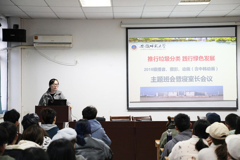 为积极响应校园垃圾分类行动的号召,营造干净整洁的学习生活环境和和谐文明的校园氛围,2019年11月29日下午,2018级播音、摄影、动画、中韩动画班级于公司四楼会议室召开主题班会,班会由辅导员老师孙月婷主持。