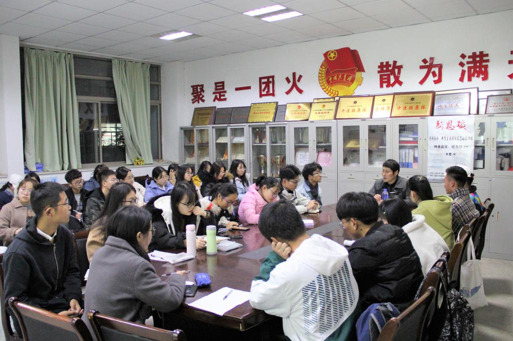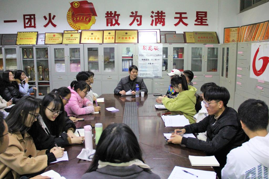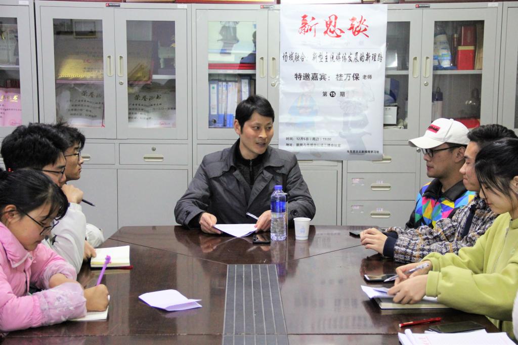 12月15日晚7点,马克思主义新闻观学习社在TapTap点点楼三楼会议室举办第十五期新思谈活动。新闻学专业教师桂万保受邀担任主讲嘉宾,与前来听讲的学子畅谈场域融合和新型主流媒体发展的新理路。