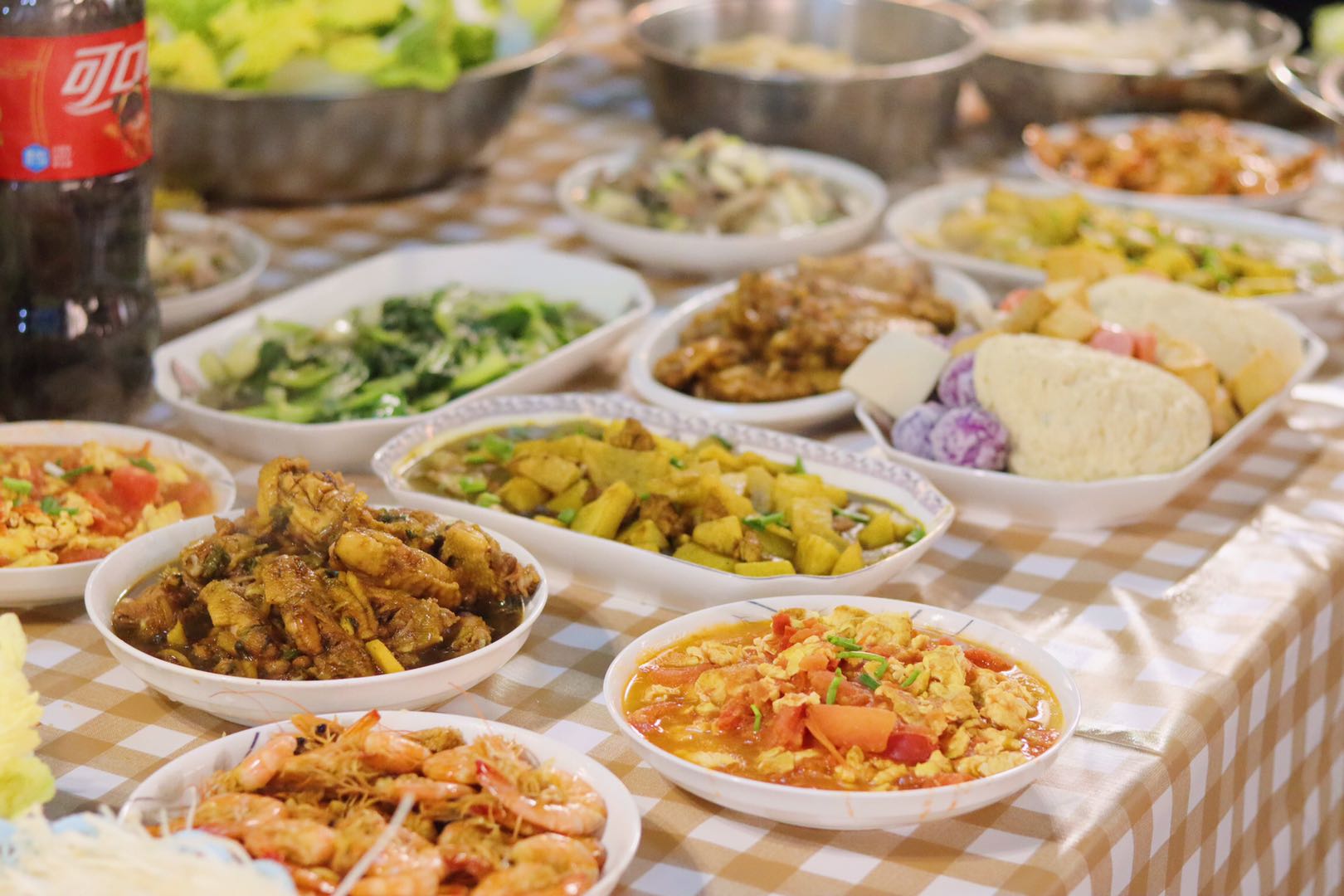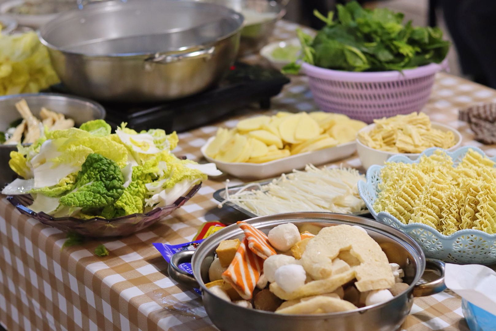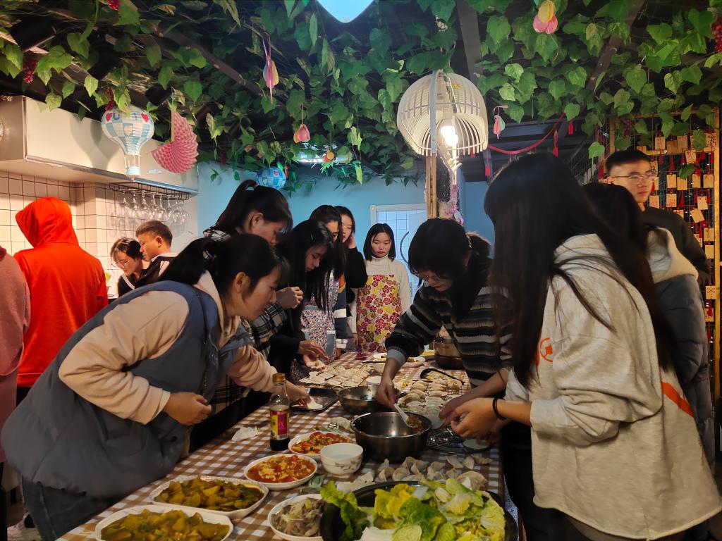 为做好本次团建工作,部分班委与部分志愿者同学共8人集合共同购买食材。尽管这天天公不作美,下着雨,天气也很冷,来到菜场,人很多,因为下雨的缘故,路也很不好走,但同学们没有一句抱怨,以菜市场的“老手”的状态熟练地砍价,有条不紊地购买食材,挑选食材的时候货比三家,仔细挑选,只为让同学们能吃到更多、更好、更新鲜的食材。下午四点,同学们陆续到达轰趴馆,班委和会做菜的同学开始准备食材。轰趴团建开始后,场面更是热闹至极。一楼的KTV、台球桌,三楼的电影院、拍照区,四楼的游戏室,各种休闲娱乐设施让同学们应接不暇。二楼的厨房也成了同学们的聚集地。很多同学都来帮忙,洗菜,择菜,炒菜,包饺子,很多在家里十指不沾阳春水的同学开玩笑地说道,妈妈看到她们在干活会感动哭的。一些会做菜的同学大显身手,大家通力合作,一道道色香味俱全的美食就很快上桌了:咖喱土豆、水煮肉片、可乐鸡翅、油焖大虾、火锅、还有大家一起包的饺子,各种美食,大家围坐在一起,好似在吃年夜饭,共同迎接2020年新年的到来,这种家一样的氛围和家一样的味道弥漫在同学们的中间,充斥在同学们的心间。