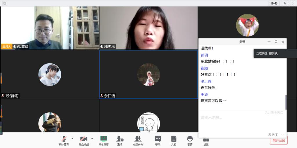 2019级新闻传播学类辅导员马星宇在3月14-15日分班级召开了网络主题班会。他结合当前疫情引发的假期延长、线上学习与专业实践等存在的问题,以“如何度过这个超长假期?”为主题为全体员工深入浅出地梳理了宅家员工的学习生活的现状、出现问题的原因、如何学习实践的方法。