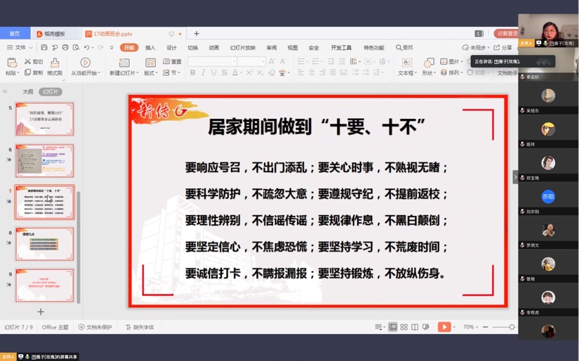 同时,张雁再次向同学重申公司近期管理要求,提醒大家未经允许不要返校返芜、不随意流动,及时进行“今日校园”信息填报,在家期间注重体育锻炼,利用网络资源自主学习,提高自己的专业素养。本次线上班会形式新颖,同学参与度高,会议圆满结束。