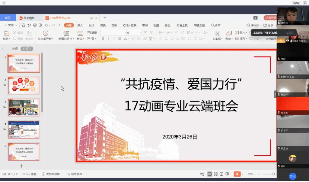 (本网讯 秦雨琪)3月26日,2017级网络与新媒体专业、2017级动画专业利用线上平台相继开展疫情防控主题班会,班会由辅导员老师张雁主持。网络与新媒体专业主任林燕参与会议,全体同学参会。