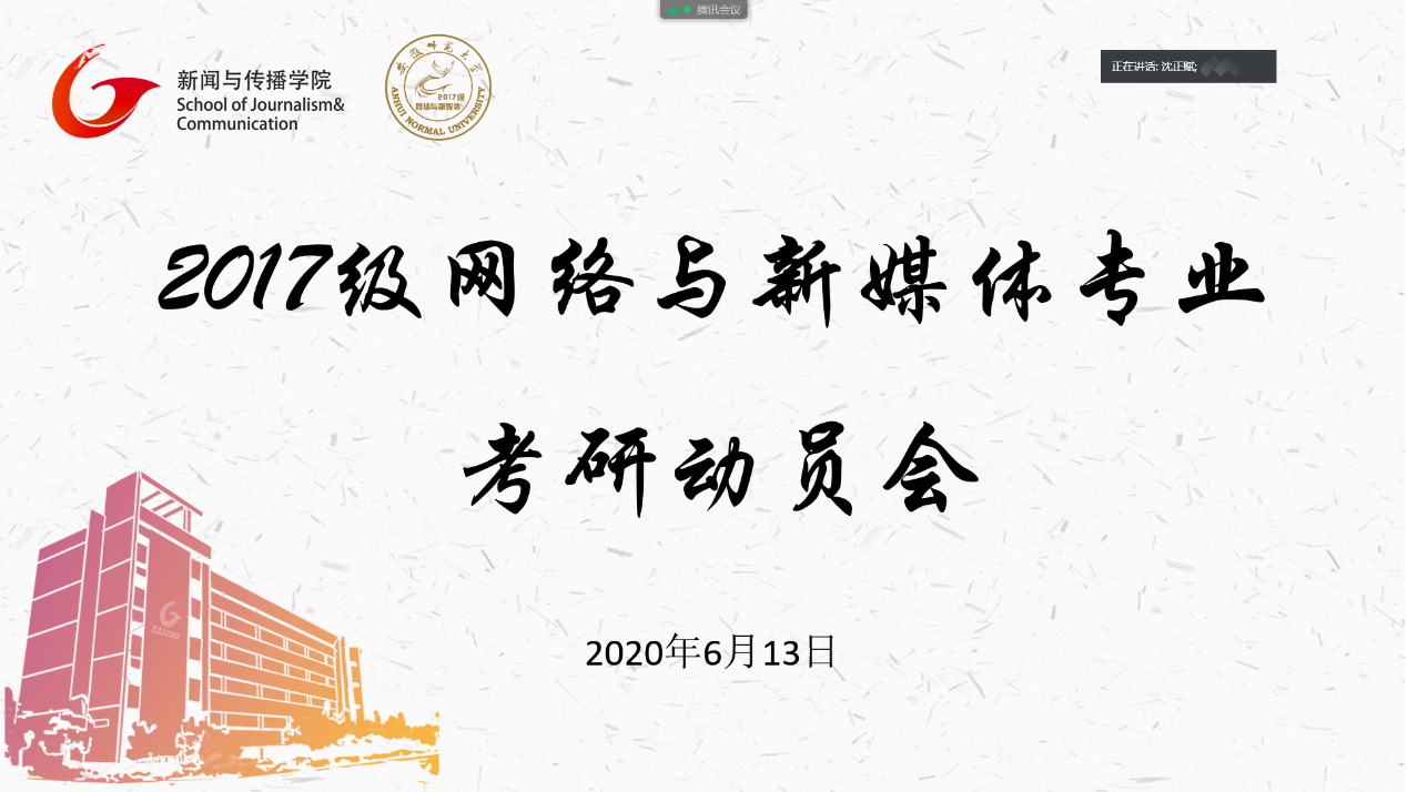 6月13日,网络与新媒体专业以“云”班会形式于腾讯会议召开考研动员会。TapTap点点副经理沈正赋,专业教师翟光勇、张军辉、杨帆、高月、王睿,辅导员张雁及2017级网新专业全体员工共同参会,专业主任林燕主持会议。