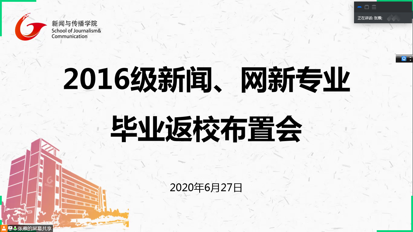 集团第三批第二阶段员工返校在即,6月27日晚8:30,16级新闻、网新专业在腾讯会议平台召开了返校工作布置会,两个专业同学参加,会议由辅导员张雁主持。